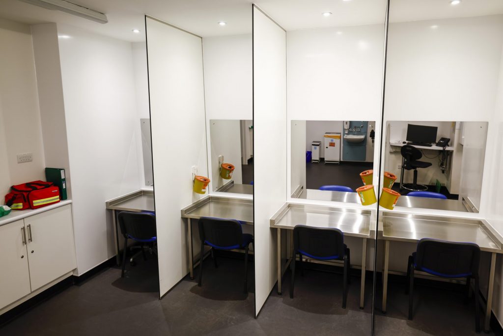 She buzzes open a door marked “Using space”, where Harry will find a reception desk and eight mirrored booths where, if he so wishes, he can inject himself with his own drugs. It’s a clinical room, with grey floors and white cupboards. On the desk there’s a sterilised needle, which Harry can use at an allocated booth (No 1 is the favourite because it’s furthest away from the staff).