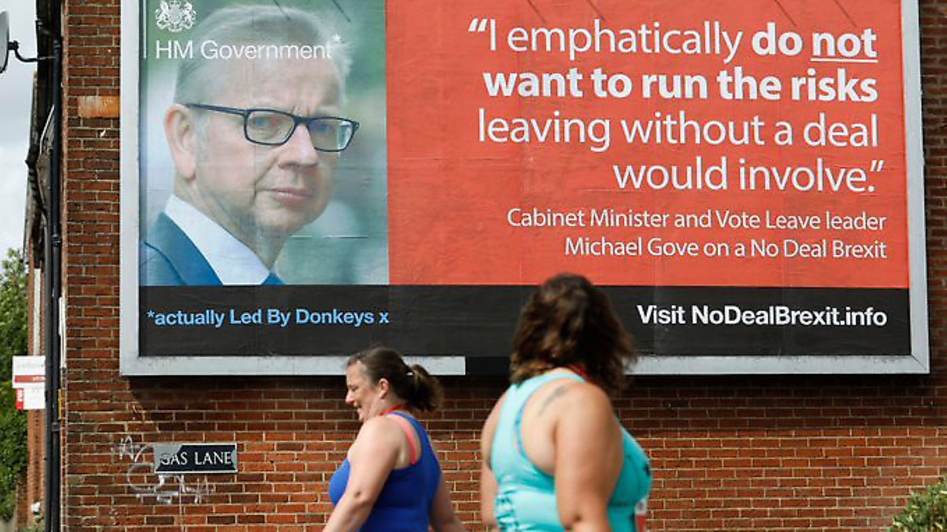 The first billboard unveiled in Salisbury features Vote Leave leader and cabinet minister Michael Gove warning MPs not to be blasé about the no-deal impact on farming.