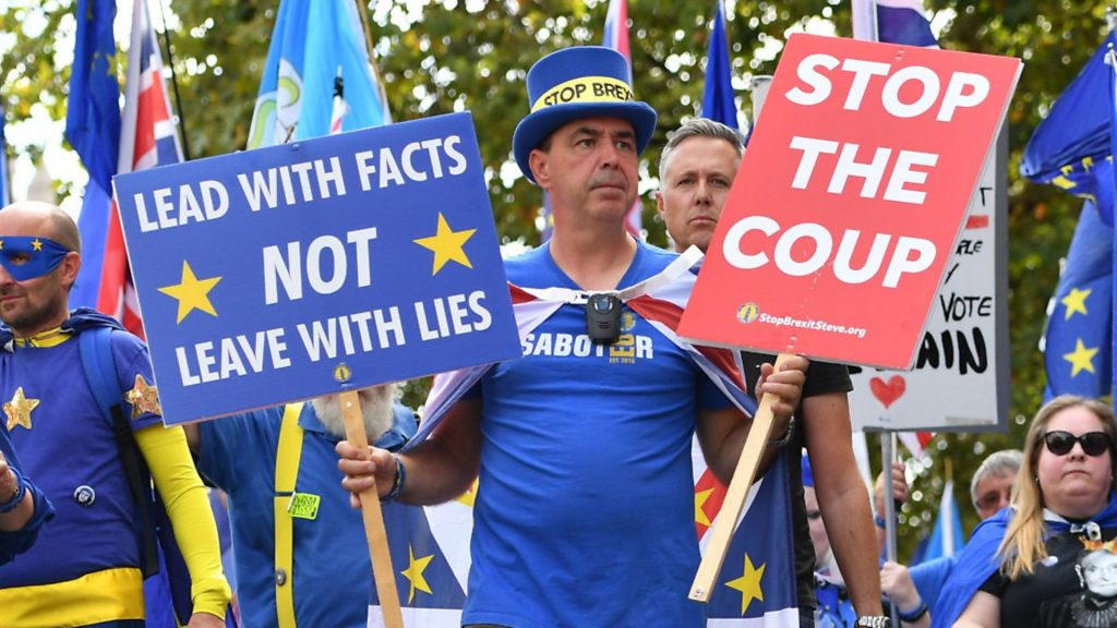 Holding two signs making clear his opposition to Brexit, Bray starts to shout at Nigel Farage as he leaves a meeting.