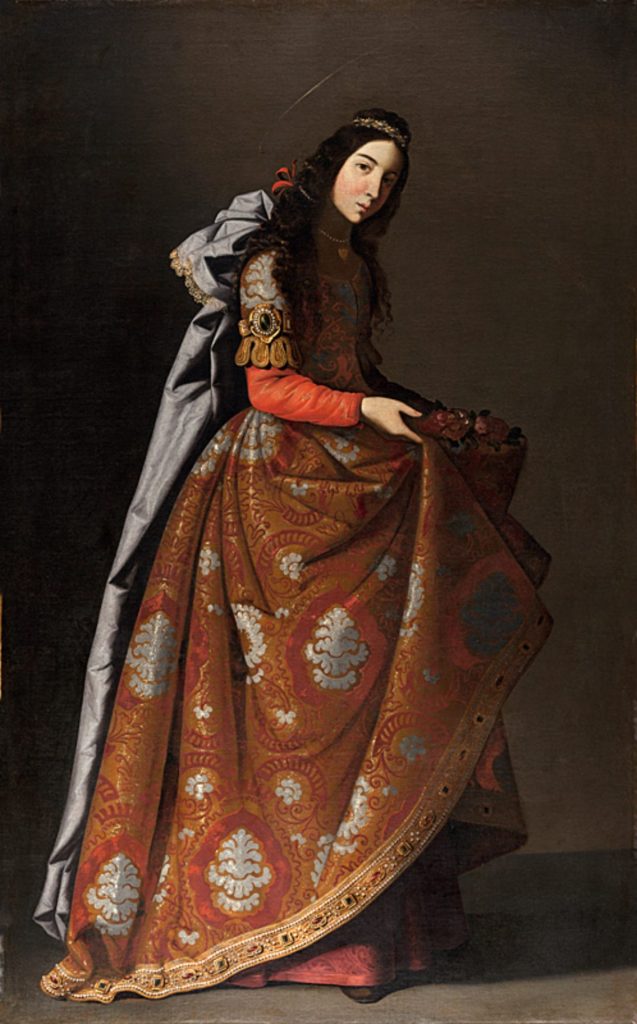 Zurbarán’s portrait shows his talent with fabric, this time jewel-encrusted braid. The bread concealed in the folds of her clothing has turned miraculously, upon inspection by suspicious soldiers, into roses.