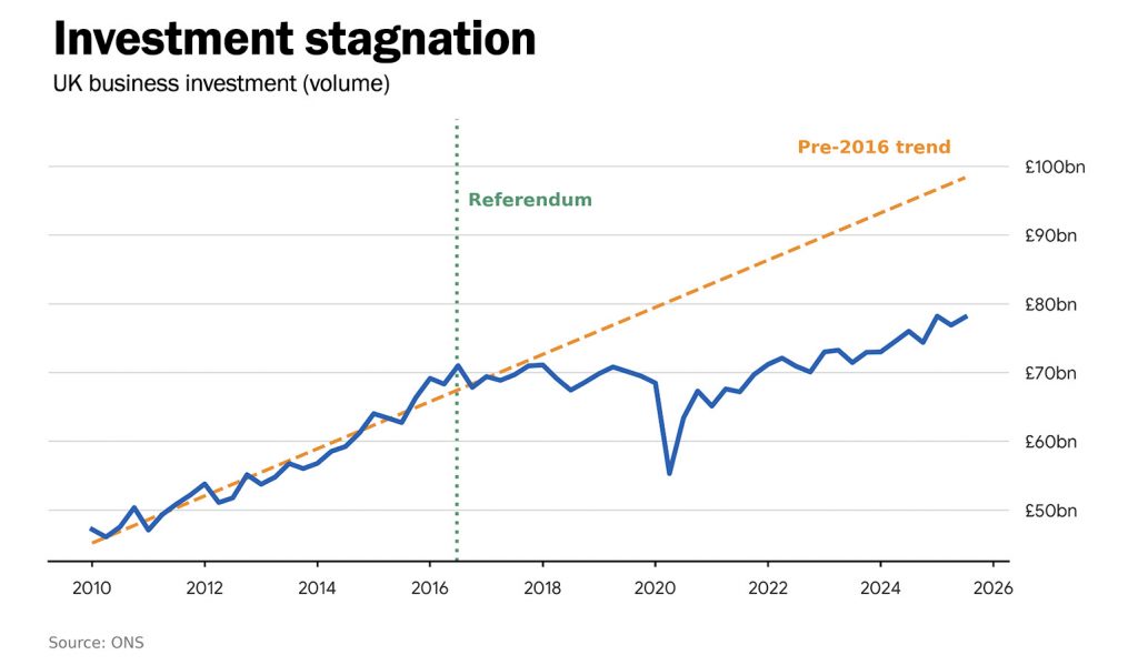 Perhaps the cleanest measure is to look at export growth in the UK and compare it to what happened in peer economies. Between 2019 and 2024 British exports grew at an annualised pace of under 0.5%, while those of Germany and France grew around twice as quickly, those of Japan grew three times as fast and those of America at four times the pace.
