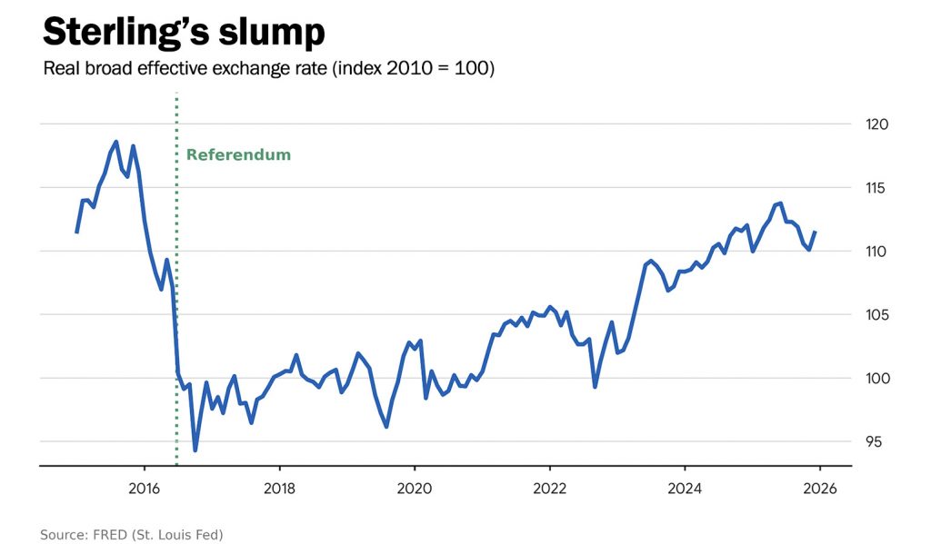The chart gives the value of sterling weighted against a range of other currencies, and shows that the sterling slump continued until the autumn of 2016. The pound then remained near its lows all the way into the early 2020s.