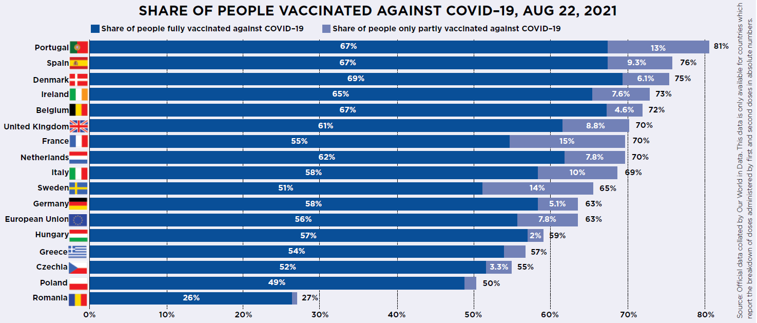 Now we’re at the end of August and things look very different. Not only does the UK not have a head start anymore, it’s been overtaken. The UK has fully vaccinated 61 out of every 100 people. Already Portugal (67 per 100), Spain (67), Belgium (67) and Denmark (69) have surpassed us in terms of the percentage of their population who are fully vaccinated, as well as those who have had one dose.