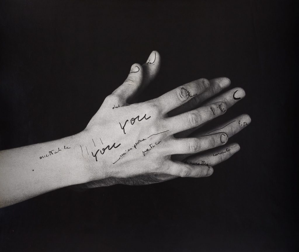 Hands became an increasingly important motif for La Rocca in the 1970s, in works that through combinations of photography, drawing and writing explore the possibility of an unmediated language of the body. In her 1971 series Le mie parole e tu (My Words and You), the forms and lines made by her hand, placed against her husband’s, create an intimate language of their own.