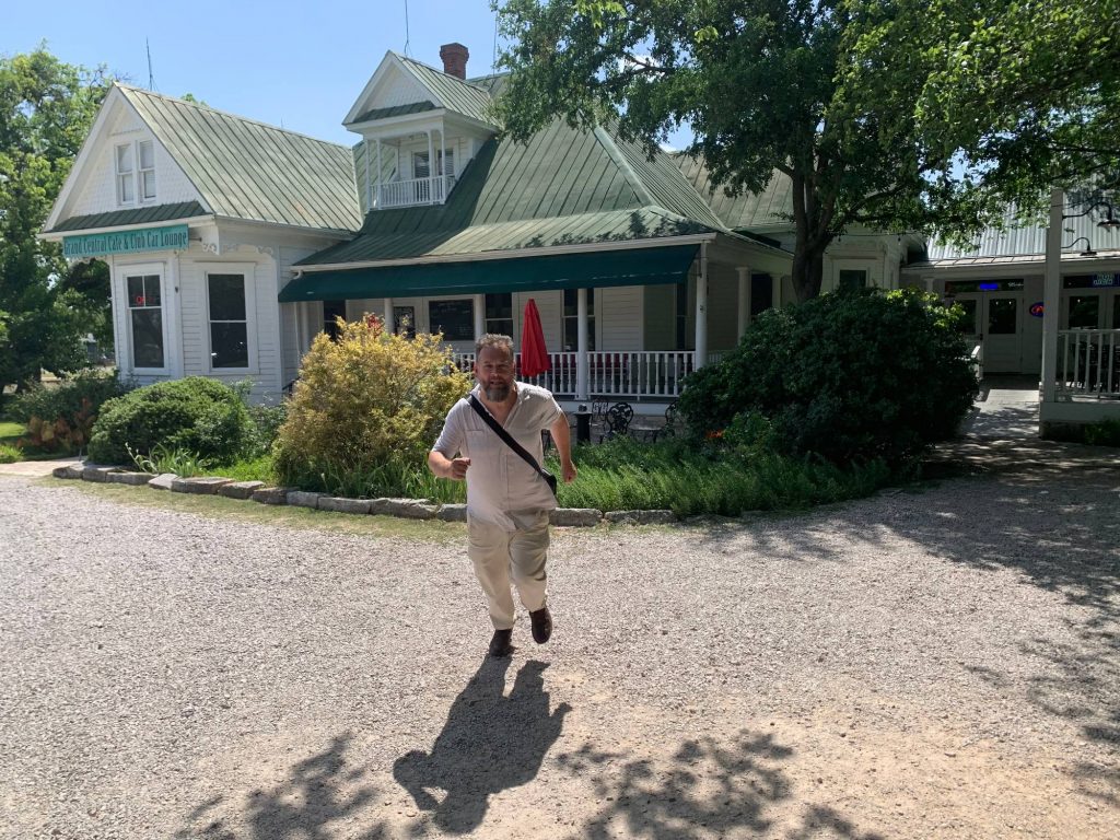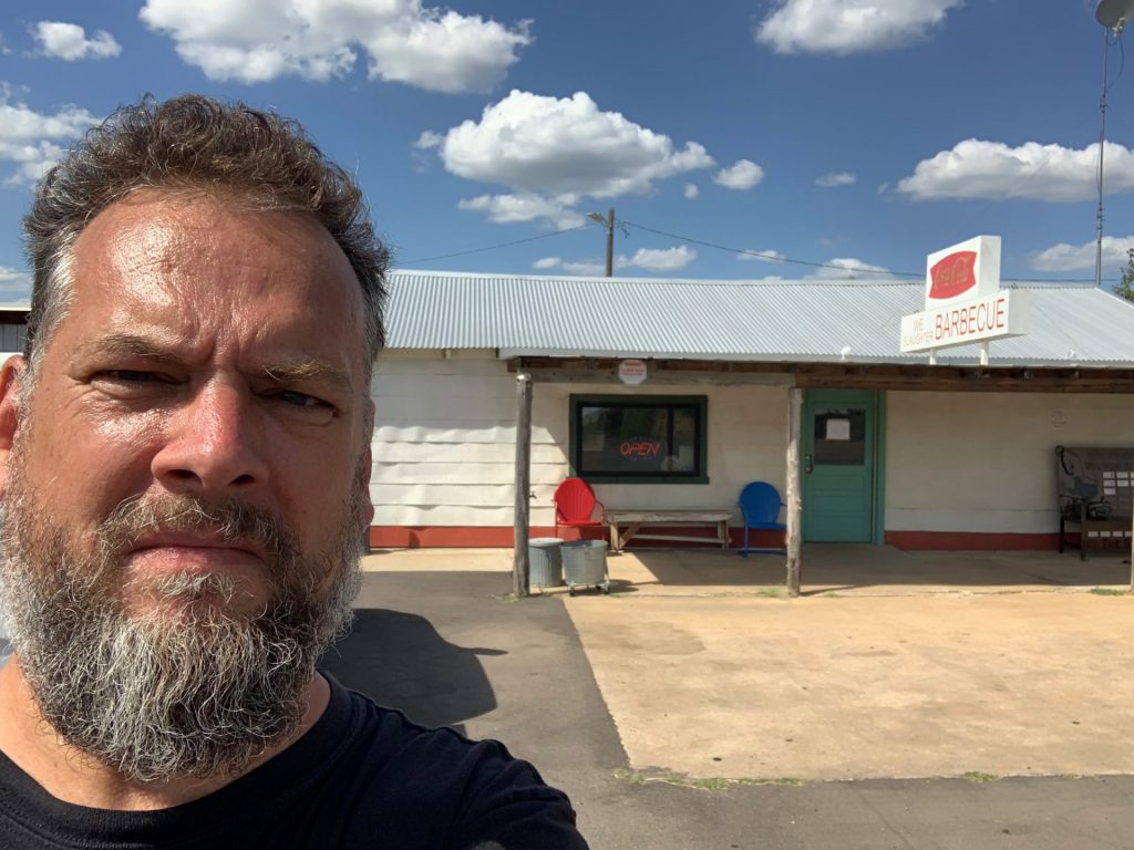 I posed for a silly photograph outside, collaring a nonplussed local to be my DP. I went on to the BBQ and gas station which was still operating, according to the Austin-based tourist site I was using.