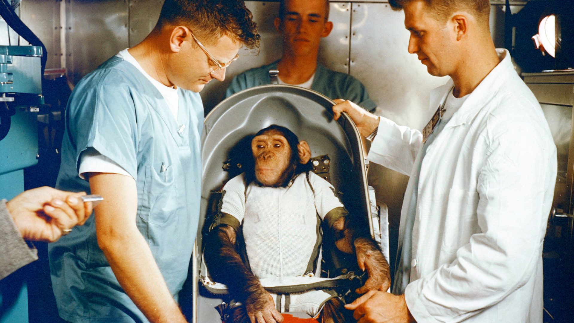 Before risking human life, Nasa needs to know if a living thing is able to think, react and follow instructions in space. Of Project Mercury’s 40 candidates, Ham is the chosen one, and for the last 15 months he has been in training, learning to pull levers and press buttons when lights flash or noises sound.