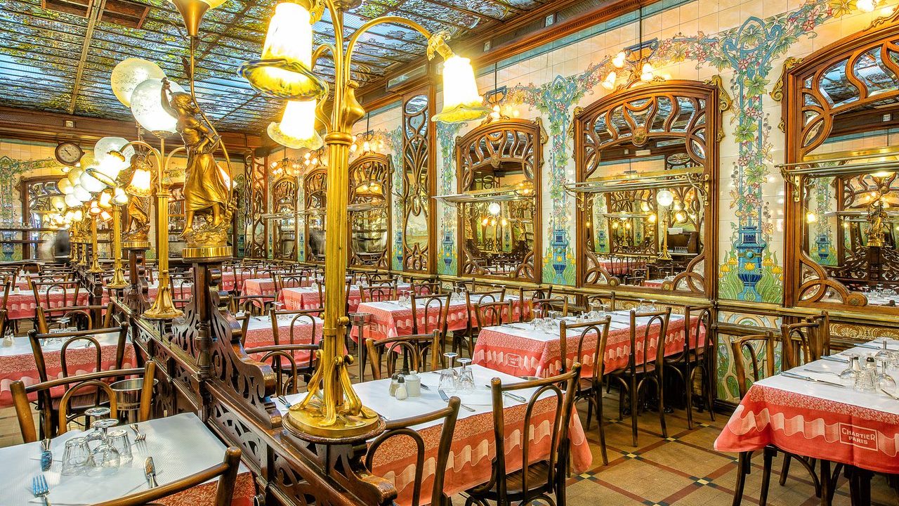 As with each Chartier, the place is lit well, neither gloomy nor zealously bright, and enlarged by precisely placed mirrors; pink linen tablecloths rest starched beneath their white paper coverings and polished brass rails run like railway tracks along panels of dark wood; 1950s prints hang on mustard walls and Merlot-coloured banquettes creak beneath buttocks.