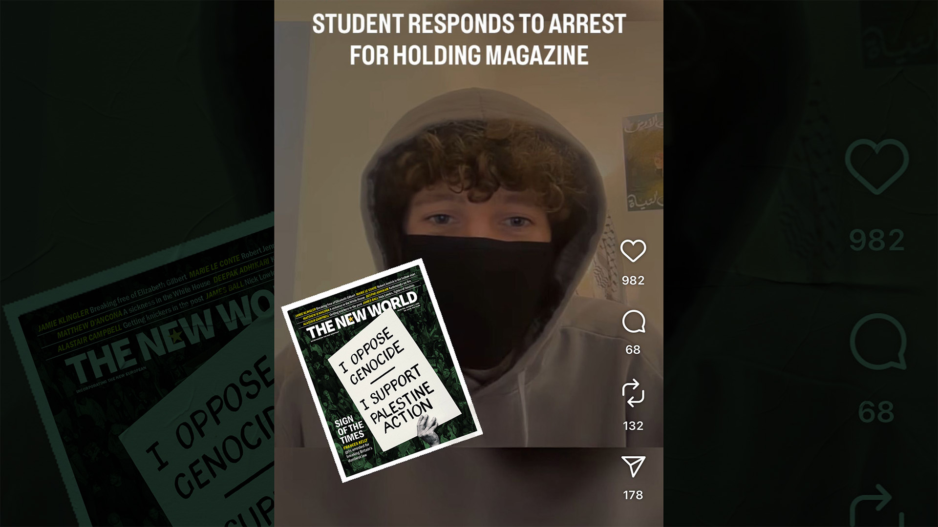 In Smith’s, he bought a copy of last week’s The New World magazine with its cover featuring a photograph of a placard bearing the outlawed words: “I oppose genocide. I support Palestine Action.”