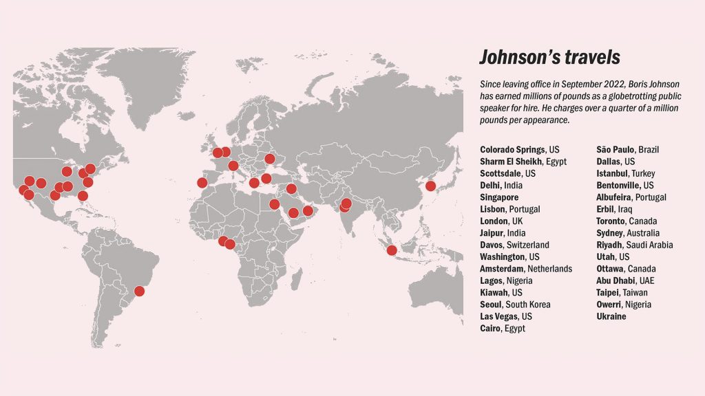 He has spoken in Dubai, Riyadh, Taipei, Owerri in Nigeria and Lynchburg, Virginia – with themes around “western values” and free speech, no doubt tousling his hair artfully before bounding to the lectern. He was paid $250,000 to speak at a private equity firm in California, and $405,000 for a turn at Centerview Partners, a US bank. Remarkably in London he seems to command a much lower fee – a speech in 2022 netted him a measly £60,000. He has squeezed in working trips to Texas and Japan as well as holidays in the Caymans and Greece, and a “reporting” trip to Ukraine, filming for an upcoming Channel 5 show called Boris Johnson: In The Kill Zone.