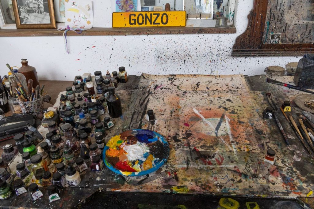 The table is a work of art in itself, a palimpsest of ink stains collected over decades of book signings and improvised, out-of-studio sketching. His youngest daughter, Sadie Williams, curator and managing director of the Steadman Art Collection, grew up in the house and lives in one wing with her husband and two sons. She is quietly omnipresent and attentive as her dad is staring down the barrel of 90 – his birthday is May 15 – because daily life is not always easy, nor is his memory as sharp.