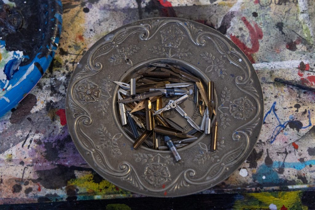 Sadie says her father always managed to create and draw with whatever was at hand, bits of paper, masking tape, chopped-up pages from magazines, once even a tissue she had in her hand. “Everything goes into his work… when I was a child he drew everything, people, things in the park… I grew up surrounded by his art.
