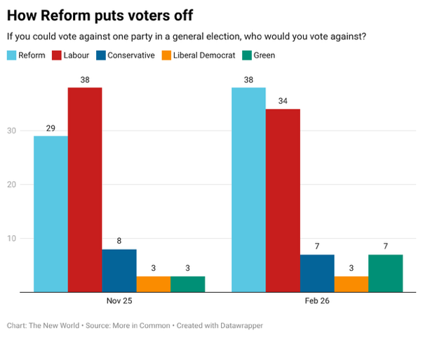 Another factor that separates Reform from the SDP is that few voters actively disliked the SDP, whereas Reform has generated increasing hostility. Last November, and again this February, More in Common asked respondents not just which party they would support, but which they would vote against.