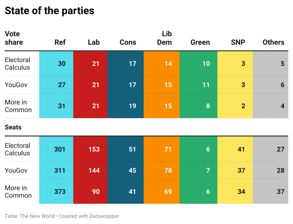 Three recent surveys tell broadly similar stories. With around 30 per cent of the vote across mainland Britain, Reform would be by far the largest party. More in Common gives Farage a clear majority, YouGov and Electoral Calculus show him a little short of the 326 seats needed for outright victory.