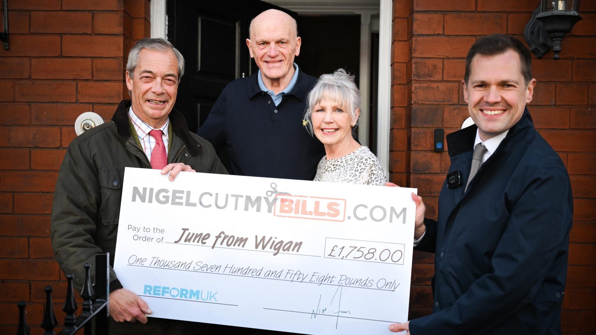 “What a fantastic surprise for two of our staunch Wigan Branch Members and ALL of their neighbours today, when Nigel Farage knocked on their door with Robert Jenrick in tow, to present them as winners of the recent ‘Nigel Pay My Bills’ competition – the winners and EVERYONE in their street, gets their bills paid for a Year!! [sic],” cheered the party’s local branch on Facebook. “Congratulations to a very deserving and truly lovely couple.”