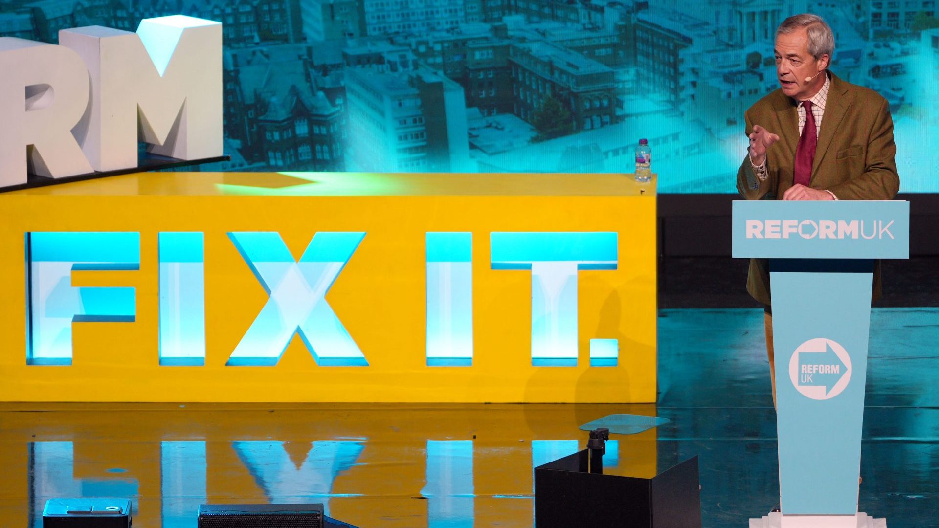 And then Farage, dressed in his customary mustard cords, delivered much of his speech in front of an enormous sign announcing ‘REFORM WILL FIX IT’.