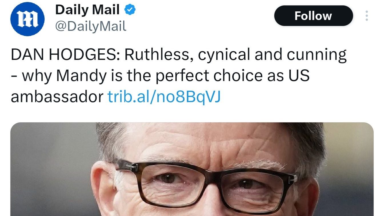 Alas, X’s word count meant that Hodges did not also have to space to comment on the pundit who, upon Mandelson’s appointment as US ambassador in December 2024, wrote a newspaper article with the headline “Ruthless, cynical and cunning – why Mandy is the perfect choice as US ambassador”.