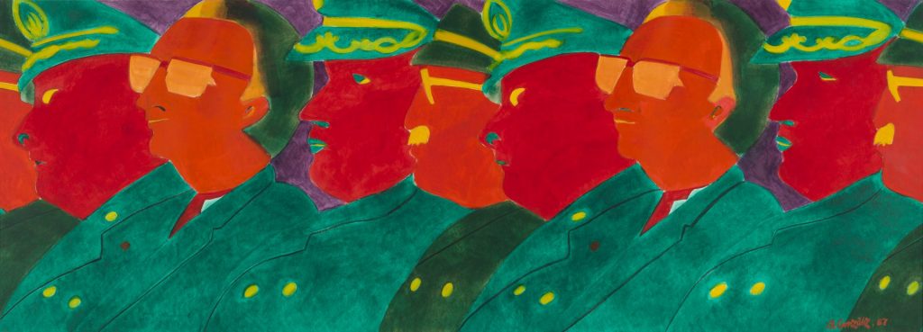 A 1986 version in muted colours has him smiling contentedly at a charred corpse laid out before him, while in another painted the following year, the corpse is replaced by a bunch of flowers. Their brilliance and his smile are a mockery of the tragedy.