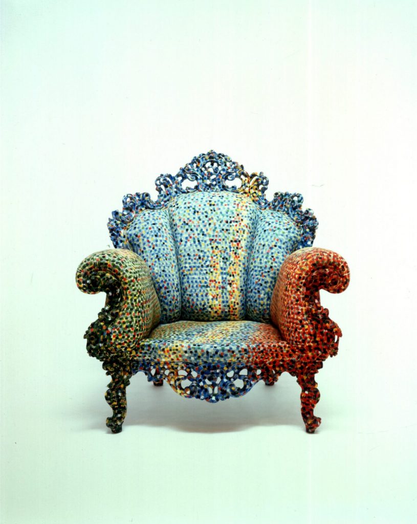 And so to the selection inspired by Marcel Proust. Mendini was fascinated by the writer and his obsession with the past and decided to re-imagine the great writer’s armchair. He took a neo-Baroque piece, projected a slide of a Signac painting on to the surface and added the dots directly on it.