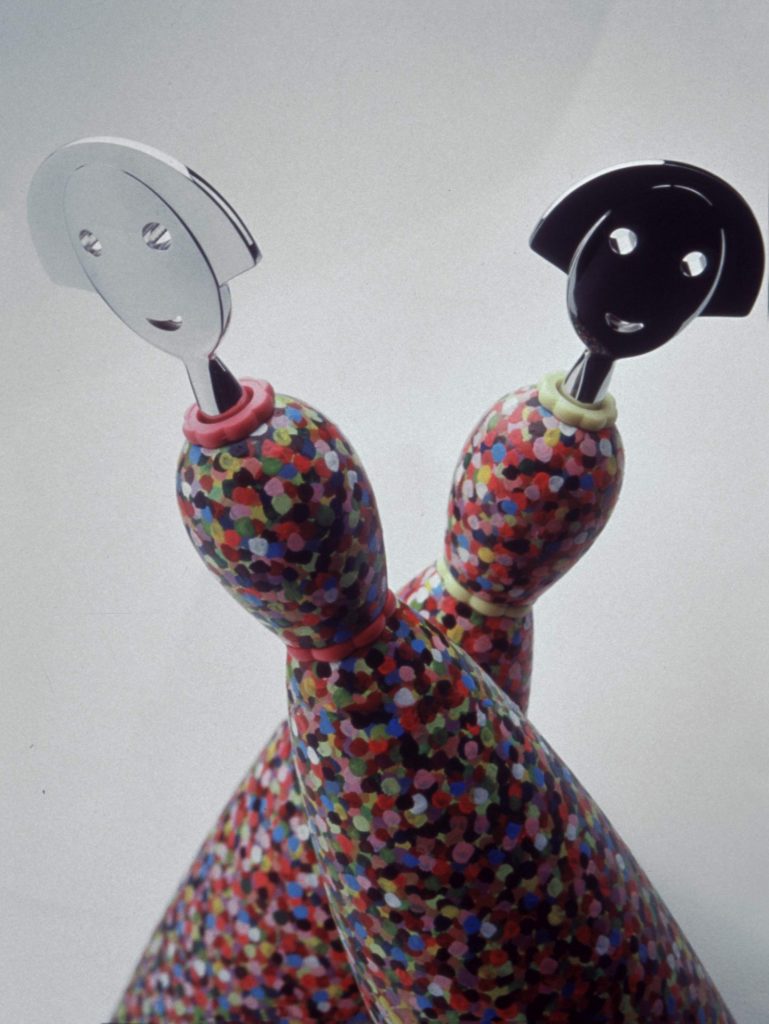 Perhaps they have become something of a cliche, but the apparent frivolity of his creations was born out of a serious intent to radicalise how the everyday could look, summoning the talents of some of the most influential cultural figures of the 20th century for inspiration. Here, Anna and Alessandro are decorated with dabs of colour inspired by the Pointillist painter Paul Signac (1863-1935), proving that objects can be functional but also witty and bright.