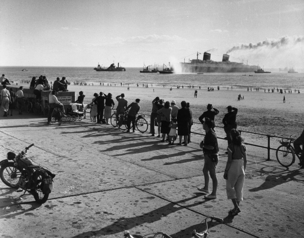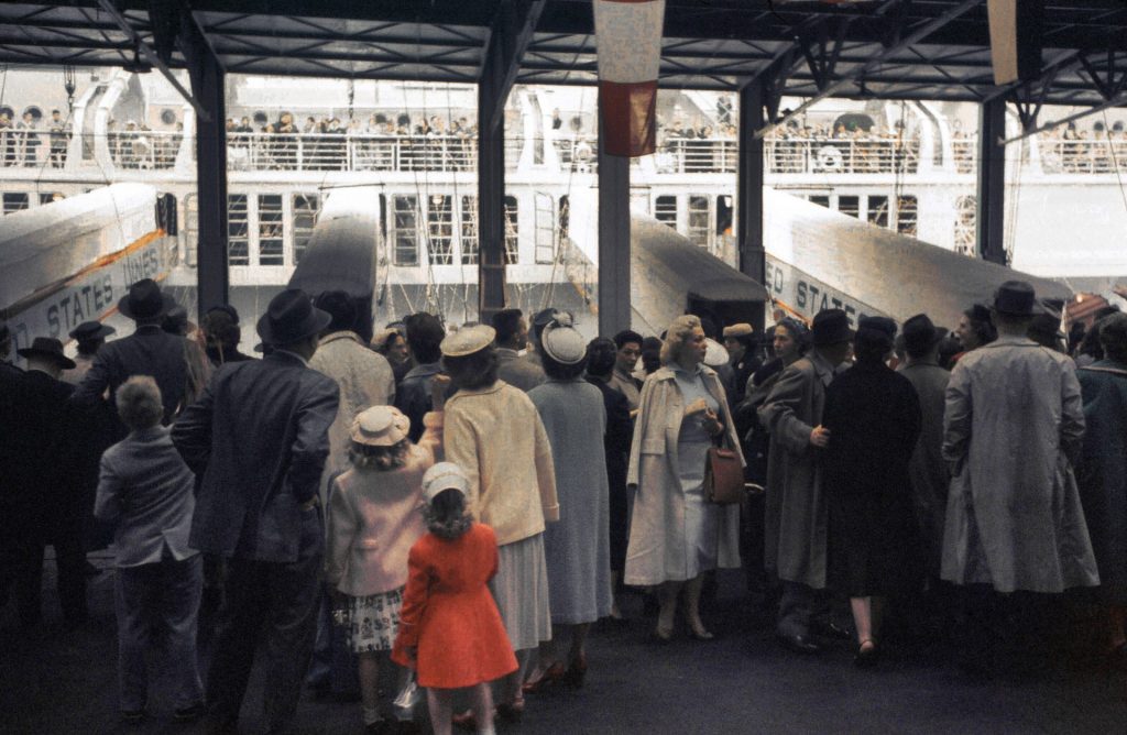 Other liners of the time had played a military role, like Cunard’s ships during the second world war. But they were fundamentally civilian, whereas the United States was conceived by the military for war purposes. And it looked it – its utilitarian interior was almost almost entirely wood-free as a wartime fire prevention measure (the only wooden items, it was said, were a butcher’s block and a grand piano).